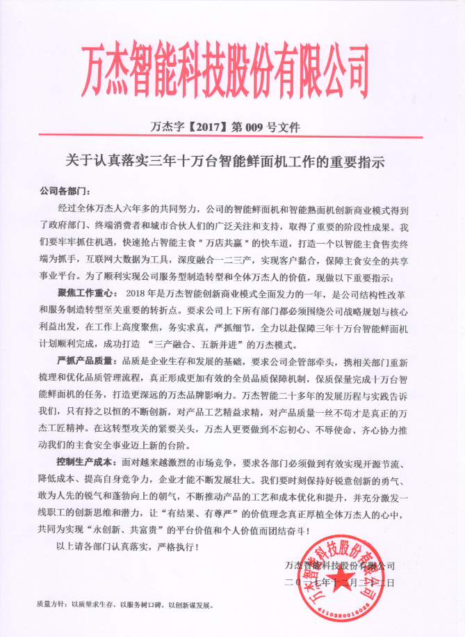 關(guān)于認(rèn)真落實(shí)三年十萬臺智能鮮面機(jī)工作的重要指示