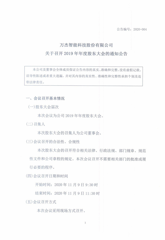 萬(wàn)杰智能關(guān)于召開(kāi)2019年年度股東大會(huì)的通知公告
