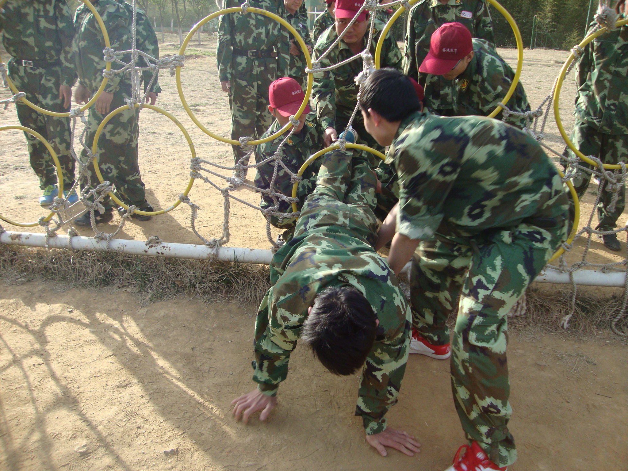 畢業(yè)墻:每個(gè)人都要翻越一堵大約4米且垂直的圍墻,這又是一個(gè)必須依靠集體的力量才能完成的項(xiàng)目。剛開始,大家都認(rèn)為這是很難完成而且比較危險(xiǎn)的任務(wù),估計(jì)需要半個(gè)小時(shí),甚至一個(gè)小時(shí)才能全部通過。 通過集思廣益,我們擬定了計(jì)劃,采用“疊人墻”的方法,讓身強(qiáng)力壯的隊(duì)員作為底座,先由兩三位隊(duì)員踩在他們的肩膀,大家奮力將他們先托上高墻,然后他們在上面接應(yīng),其他同伴踩著底座同伴的肩膀,一個(gè)一個(gè)成功地翻越了高墻。整個(gè)過程歷時(shí)不過5分鐘,活動(dòng)結(jié)束后,所有隊(duì)員都為自己和團(tuán)隊(duì)的精彩表現(xiàn)鼓掌、歡呼,那一刻的場面激動(dòng)人心! 此項(xiàng)目心得體會:首先要感謝作為底座的幾位隊(duì)友,十幾個(gè)同伴踩在他們的肩膀上,汗水、沙土粘滿了衣服,肩膀被踩出紅紅的血痕。他們的奉獻(xiàn)和付出,換來了團(tuán)隊(duì)的成功。無論在工作還是生活中,只有放下自私、愿意付出、為別人著想、才能成就自己,完成目標(biāo)。